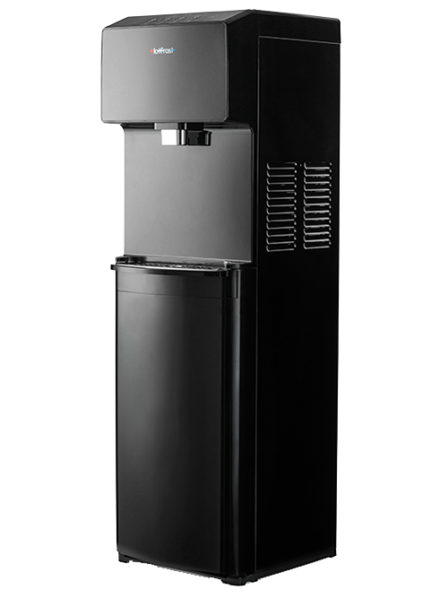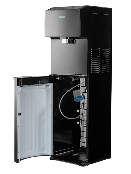 В кулере используется нижняя загрузка бутыли (в шкафчик для бутыли), для визуального контроля уровня воды, на панели управления расположен индикатор низкого уровня воды в бутыли, извещающий о необходимости произвести замену бутыли.